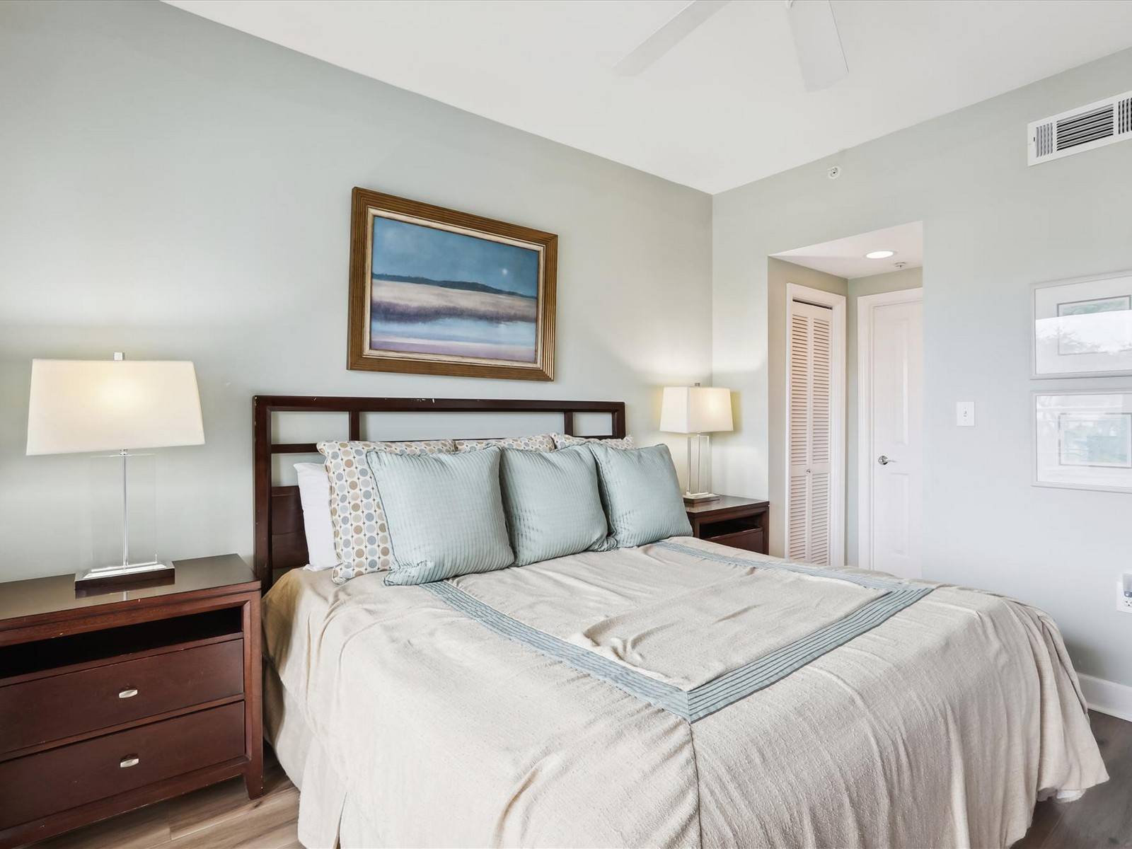 The master bedroom with a king bed and new flooring is to the left of the entrance. There is a 32″ flat screen TV, walk-in closet and a private balcony. The large, private bath has a separate shower and jetted tub. The other 2 bedrooms are located to the right of the entrance. At the end of a hall is a bedroom with 2 twin beds, new flooring and a 19″ flat screen TV. It shares a bathroom that has the standard shower/tub combination with this hallway. There is also a large laundry room off of the hallway. The third bedroom is a second master. It has a king bed, new flooring, 31″ flat screen TV and a balcony that is shared with the living room. There is a private bath with the standard shower/tub combination. 6401 Hampton Place is a stunning villa that provides a luxurious vacation experience for every member of the family.