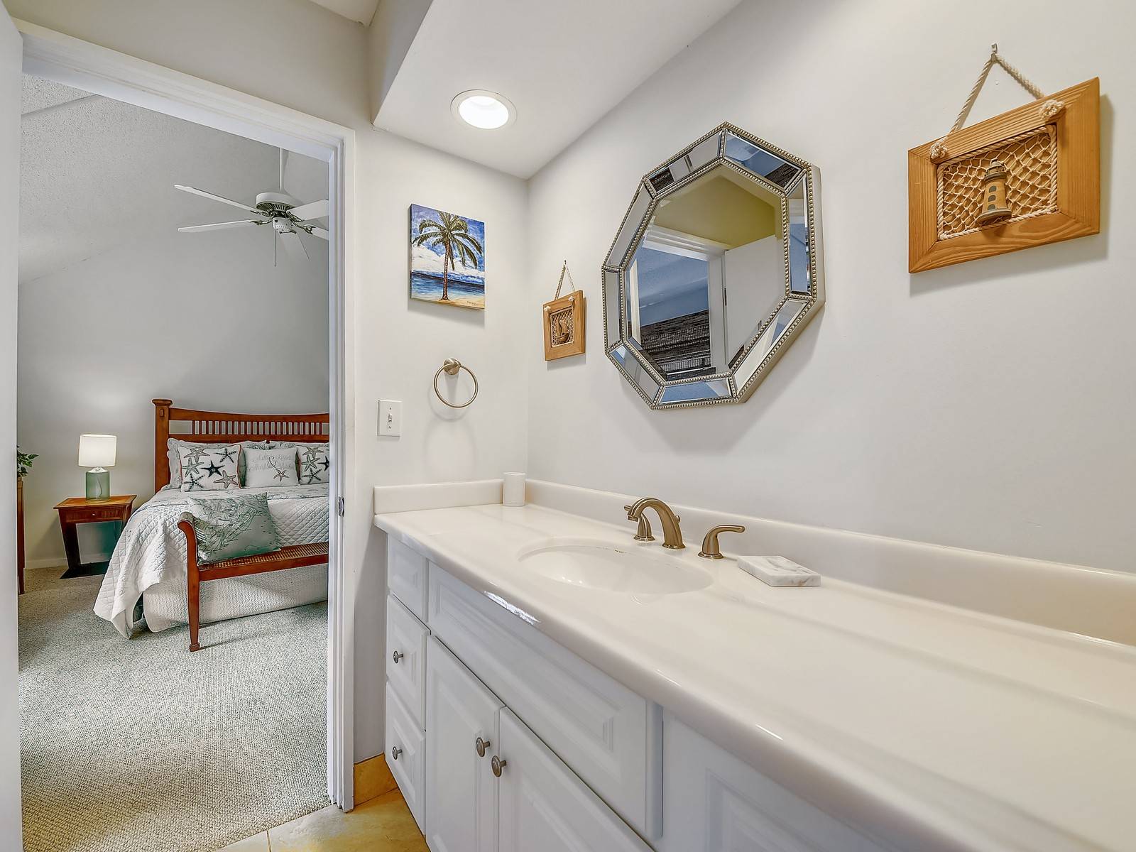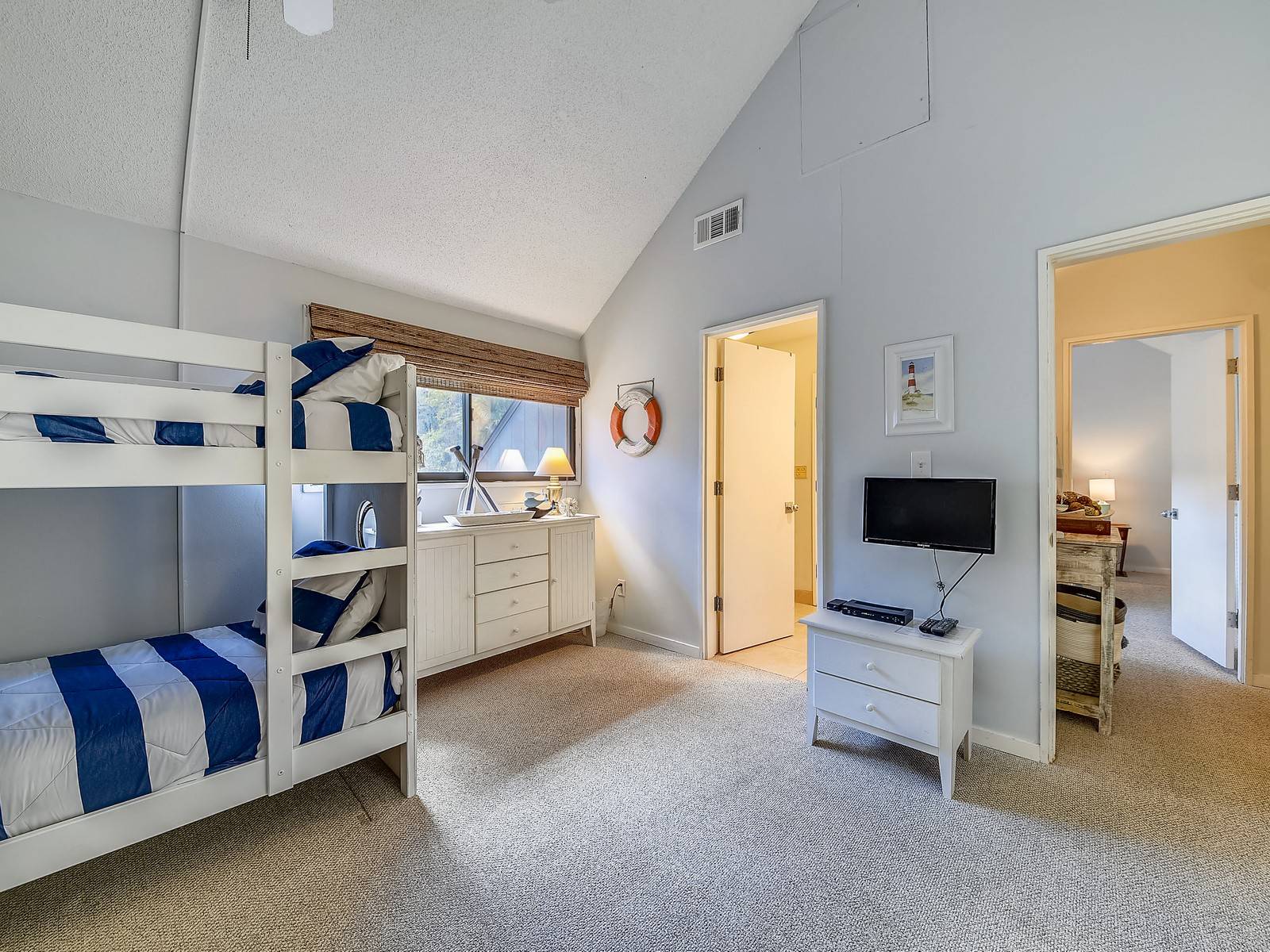 On the second floor are the two guestrooms, both carpeted, with a shared bathroom that has a single granite vanity and a walk-in shower. The first guest room has a queen bed, bench seat, armchair, angled high ceiling, and a 32″ TV. The second guest room has a nautical theme and has two twin bunk-beds and a 21″ TV.