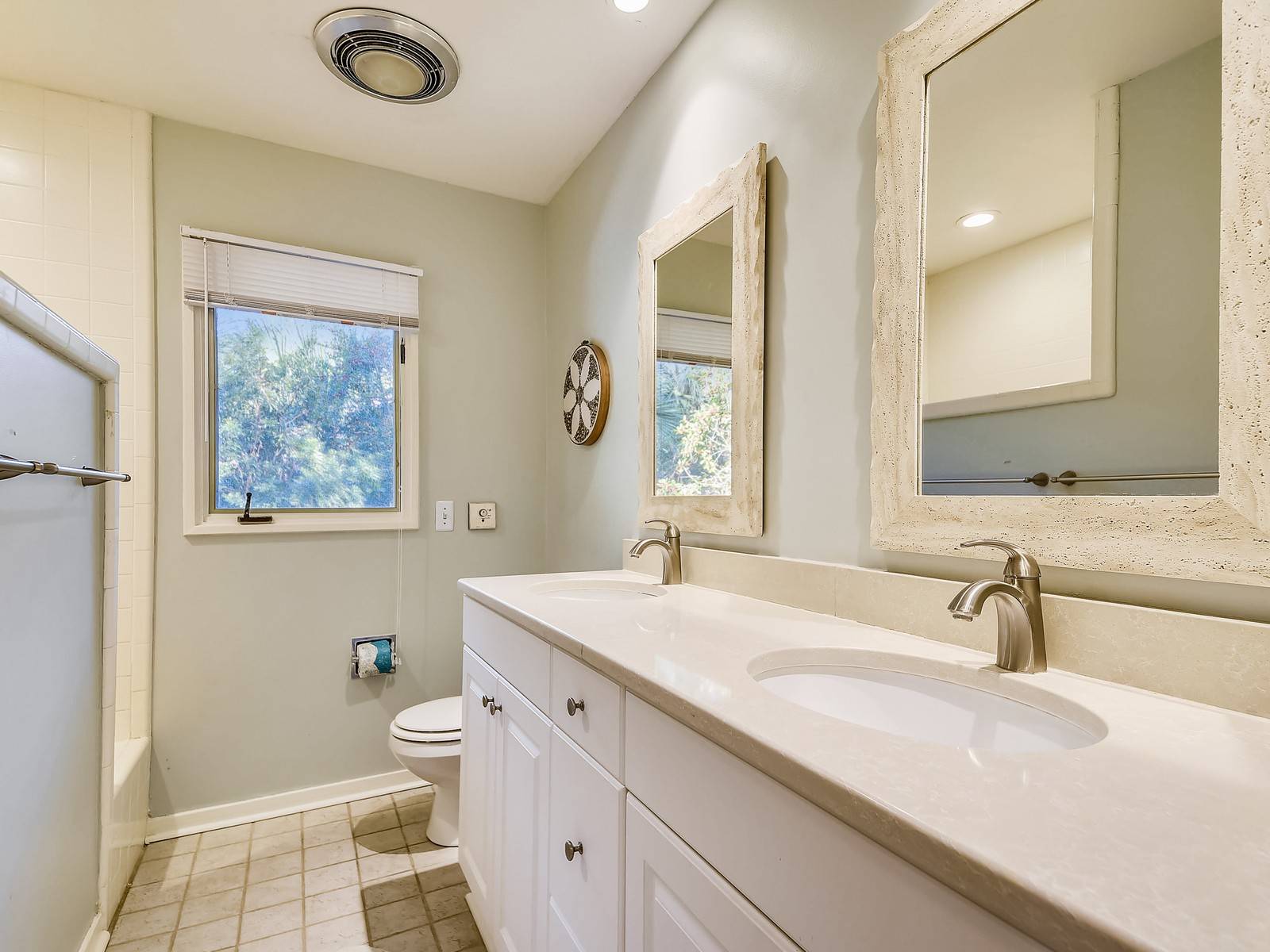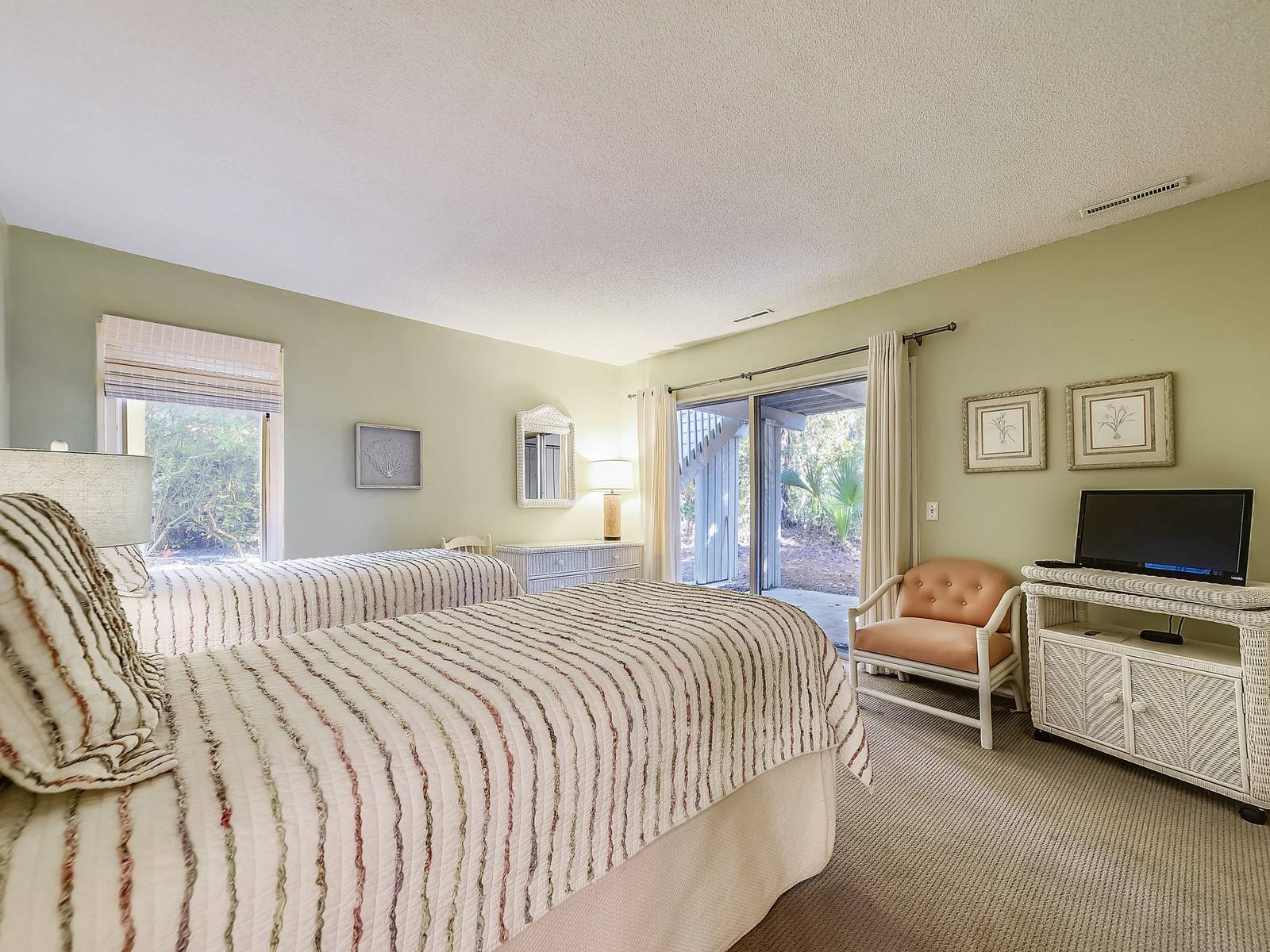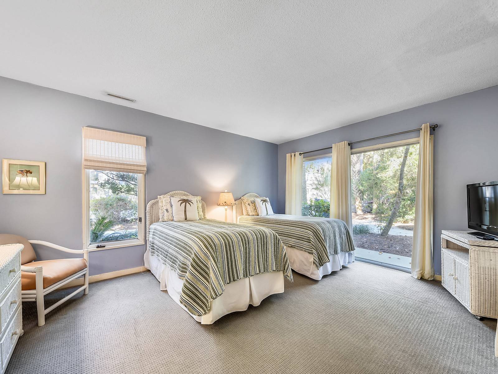 This home features a den on the lower level with TV & DVD, adjacent full bath and access to the covered patio. The private swimming pool has landscaped hedges and tall trees for privacy, and provides a variety of seating for both relaxing and sunbathing. Also on the first floor are 2 bedrooms, each with 2 twin beds sharing a hall bath with double sinks. One bedroom also has access to the patio.