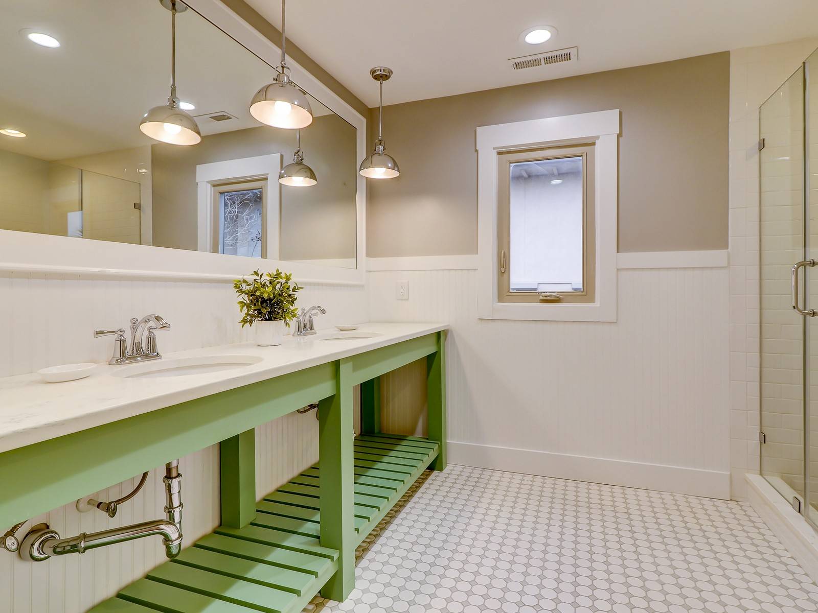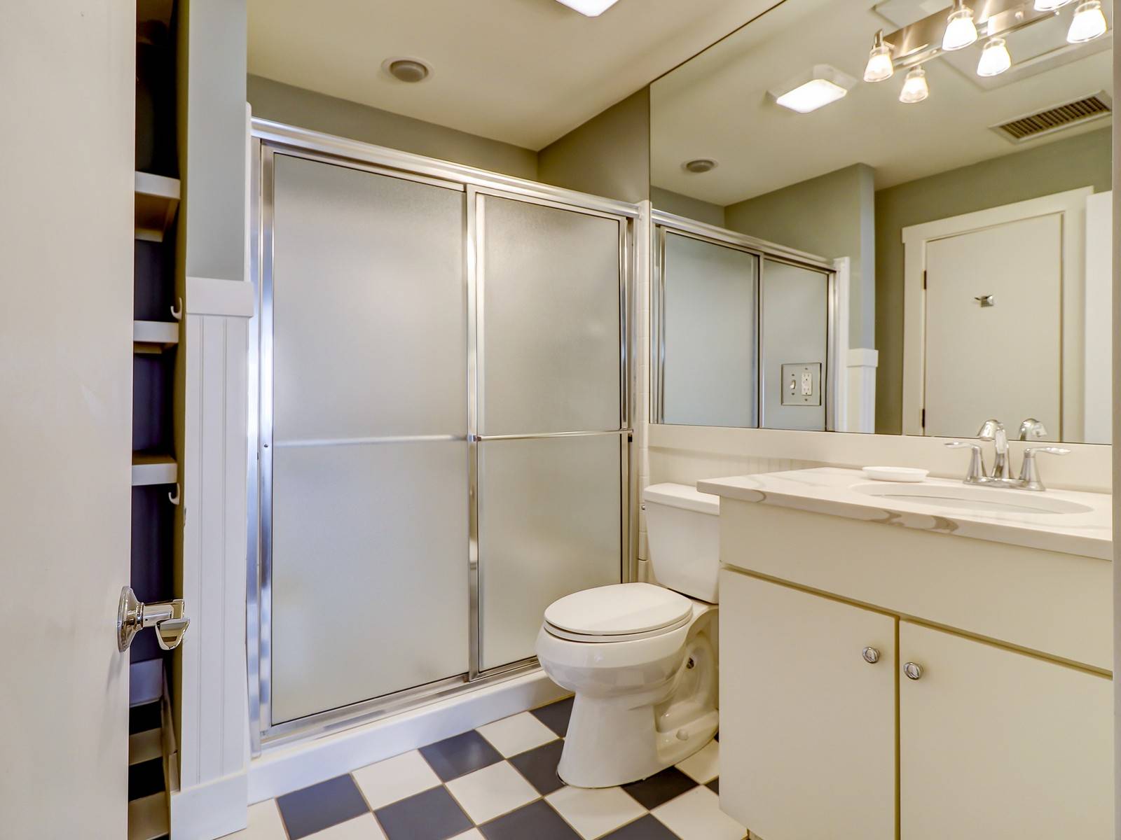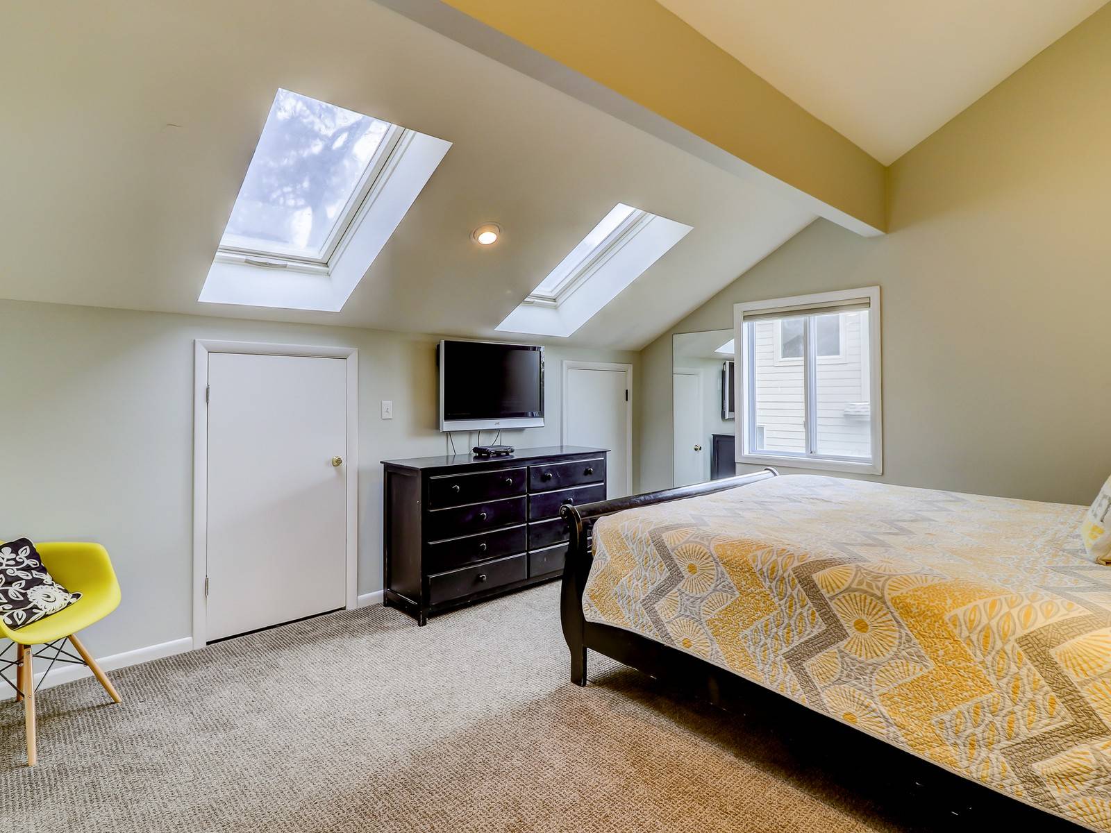 To the right of the entrance is a large room that can be used as an additional bedroom or media room. This room has vaulted ceilings with skylights, a desk and chair, a red leather sectional that opens to a queen bed, a blue leather armchair with ottoman, and a mounted 70” TV. There is also a set of stairs that lead to the additional sitting room. This room has a blue leather sofa and a bathroom with a single vanity and walk-in shower.