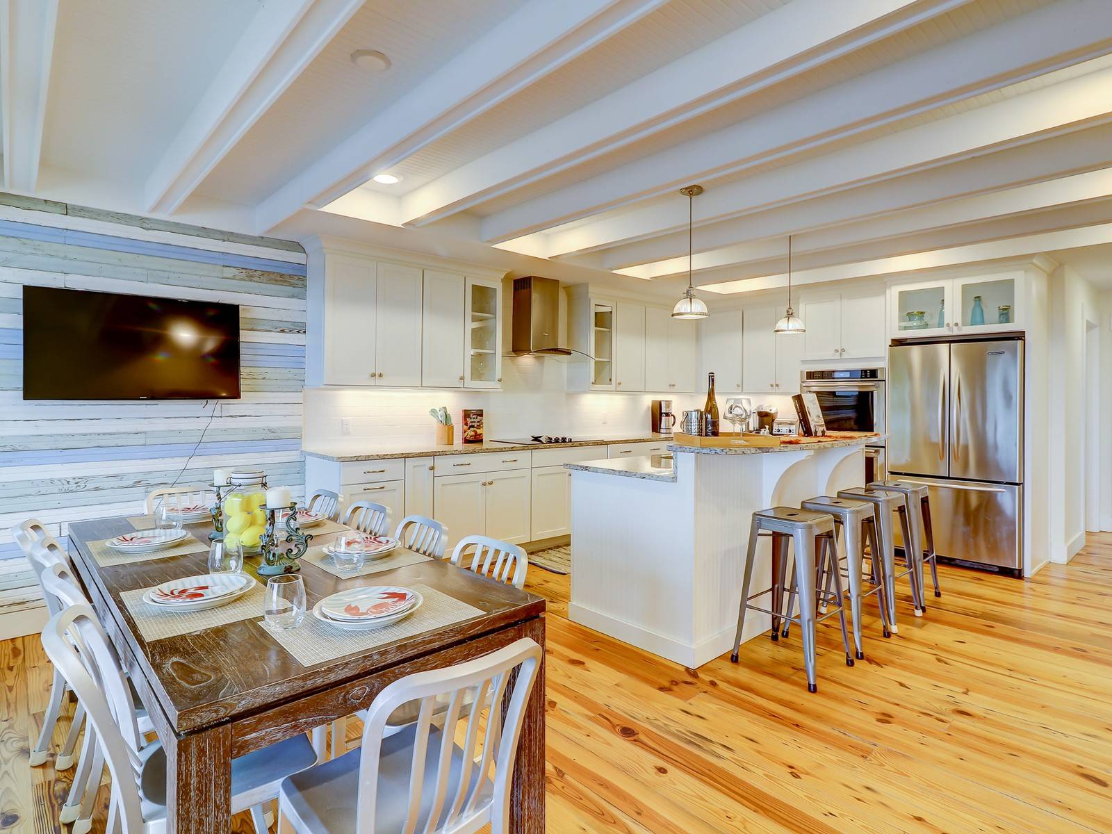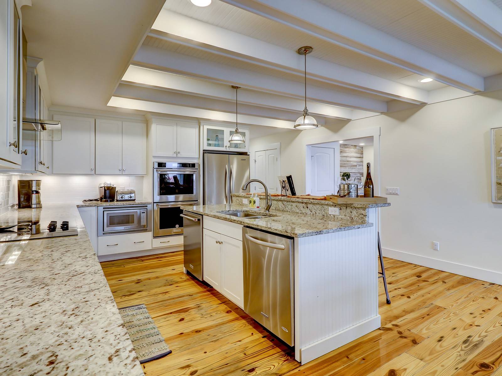 Upon entering the home, guests will find a wall of windows with ocean views, and a vaulted ceiling in the living room. There is a gray sectional, two leather recliners with ottomans, and a mounted 55” TV over the fireplace on the shiplap accent wall. The fully equipped kitchen has granite counters, stainless steel appliances, double ovens, two dishwashers, and four bar stools at the center island. Behind the couch is the wooden dining room table that seats ten. There is a door that leads to the outside. Behind the living room is a wine fridge and a granite countertop. Down the hall from the kitchen is a laundry room with full-size washer/dryer.