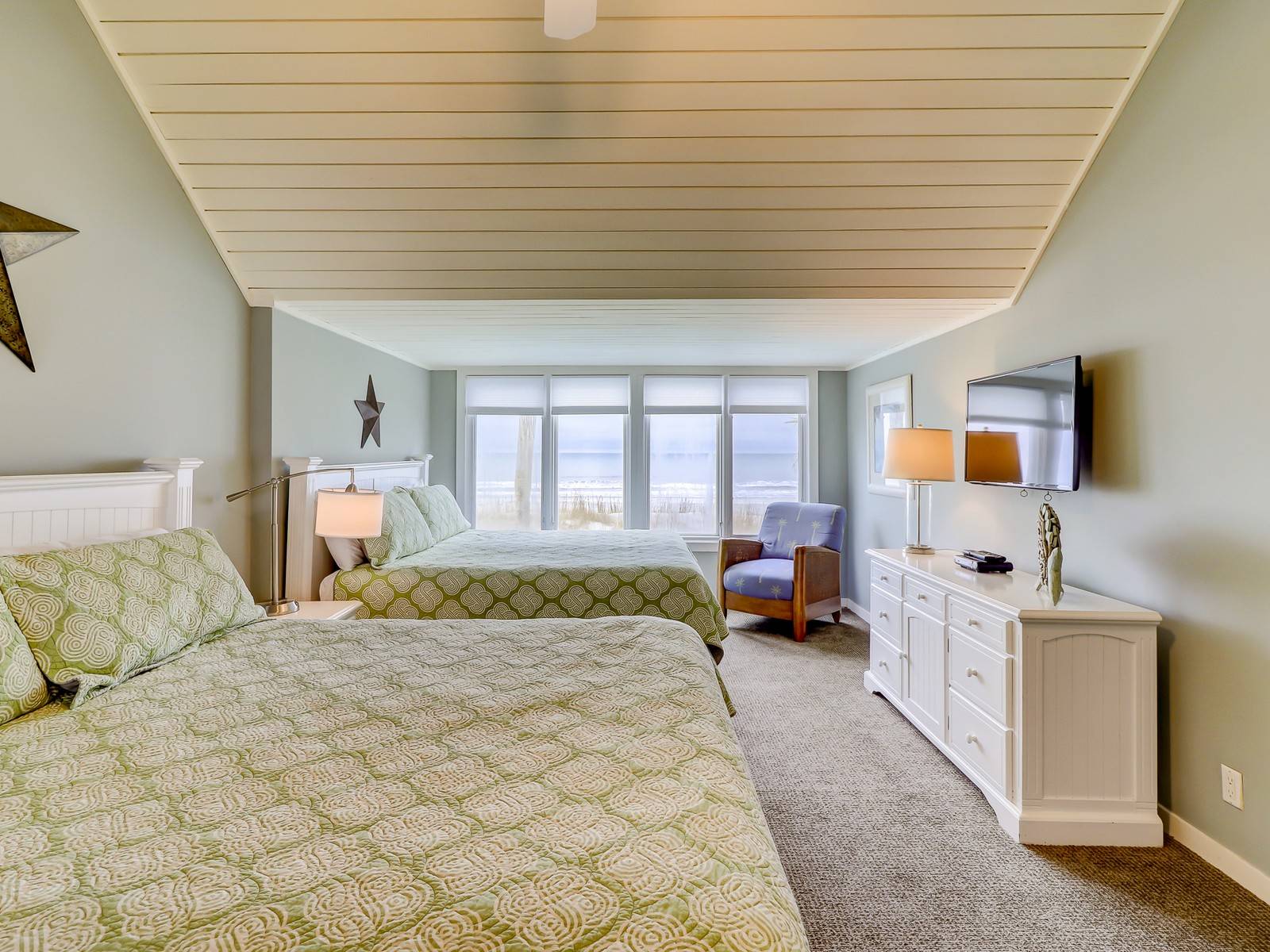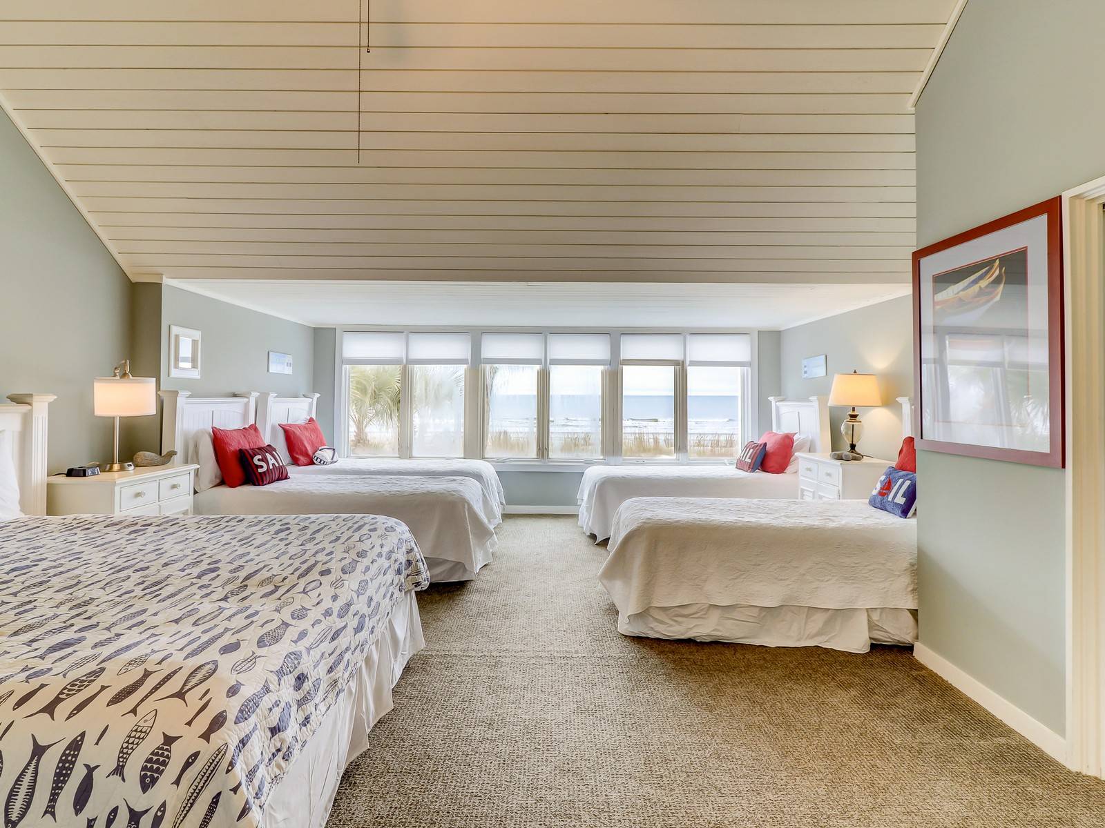 On the second floor are the remaining four bedrooms and the lounge area, all which are carpeted. The first bedroom has a slanted vault ceiling with skylights, a king bed, and a mounted 36” TV. The private bathroom has a single vanity and a walk-in shower. The bedroom across the hall has a king bed and four extra long twin beds, and a mounted 32” TV. This room has a wall of windows that show the ocean. The bathroom is shared with the hall and has a single granite vanity and a walk-in shower. At the other end of the hall there is a bedroom with two king beds, an armchair, and a mounted 40” TV. This room has ocean views as well. The final bedroom has a king bed, two leather recliners, ocean views, and a mounted 40” TV. These two rooms have access to the hall bathroom with double granite vanities and a walk-in shower. Swinging doors may be used for privacy at opposite ends of the hallway.