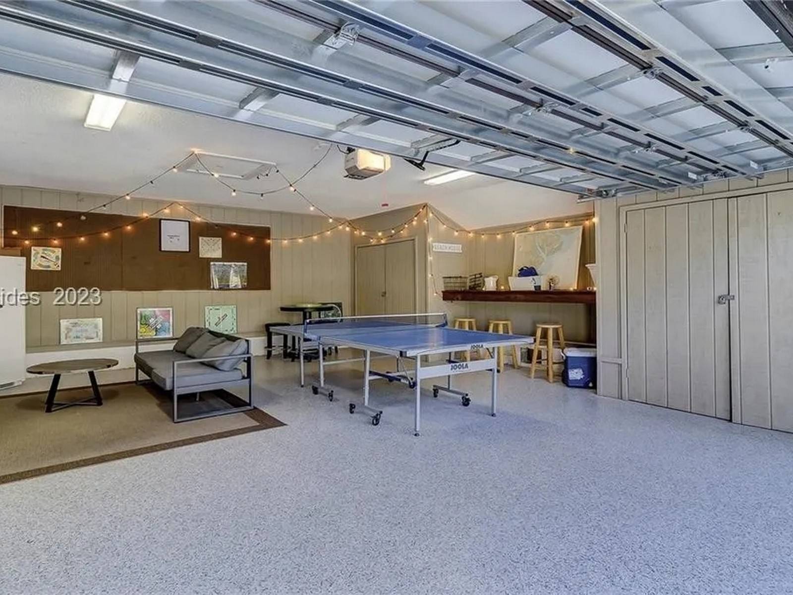 The oceanfront pool is the perfect setting for lounging, grilling, and relaxing. The very large deck with bench seats, comes equipped with a Char-Broil propane grill and a grilling and prep area for the chef. The large kidney shaped pool is great for families and has an elevated spa that waterfalls into the pool, all of this while enjoying the breathtaking ocean views that will remind you why you get away to Hilton Head Island! There are six lounge chairs and a teal high-top table that seats six. Plus, guests can enjoy a Ping-Pong table for tournaments in the garage! There are decorative lights that hang on the ceiling, a round high-top table with four stools, a couch, full-size fridge, and a mounted 40” Roku TV. This is the perfect home for your next escape to Hilton Head!