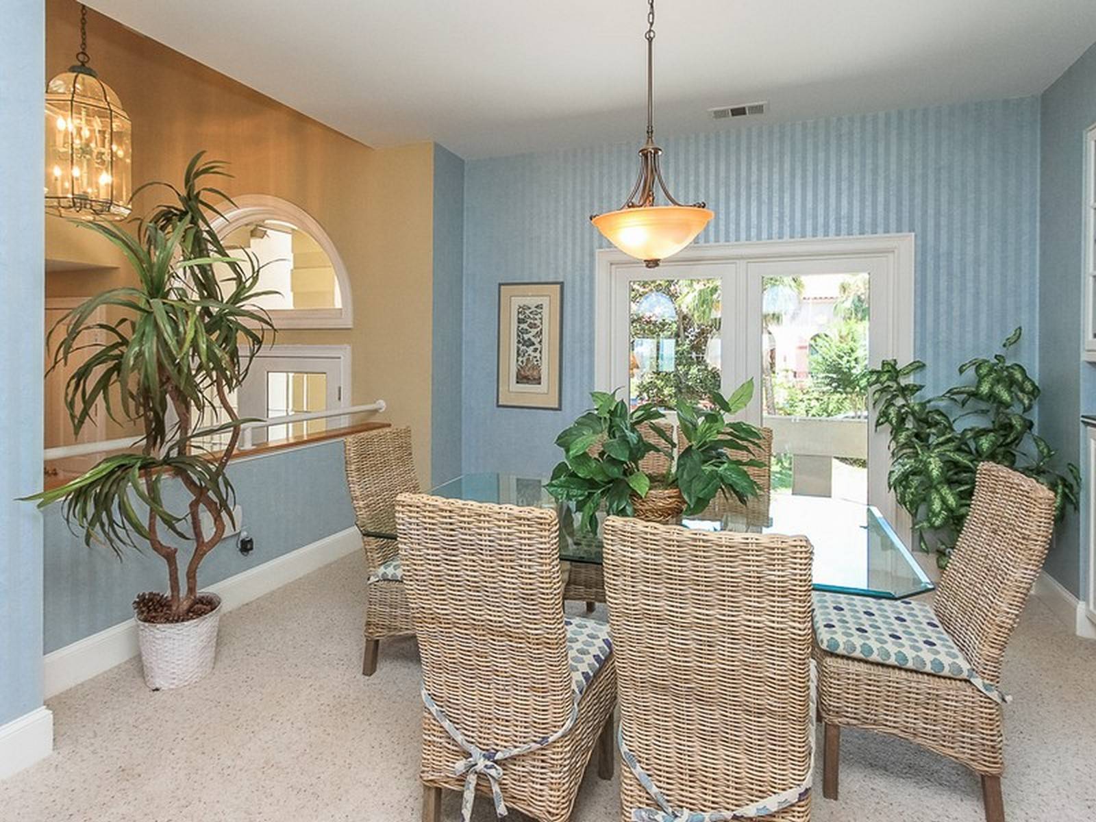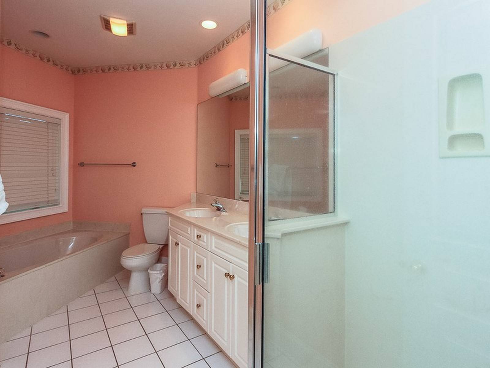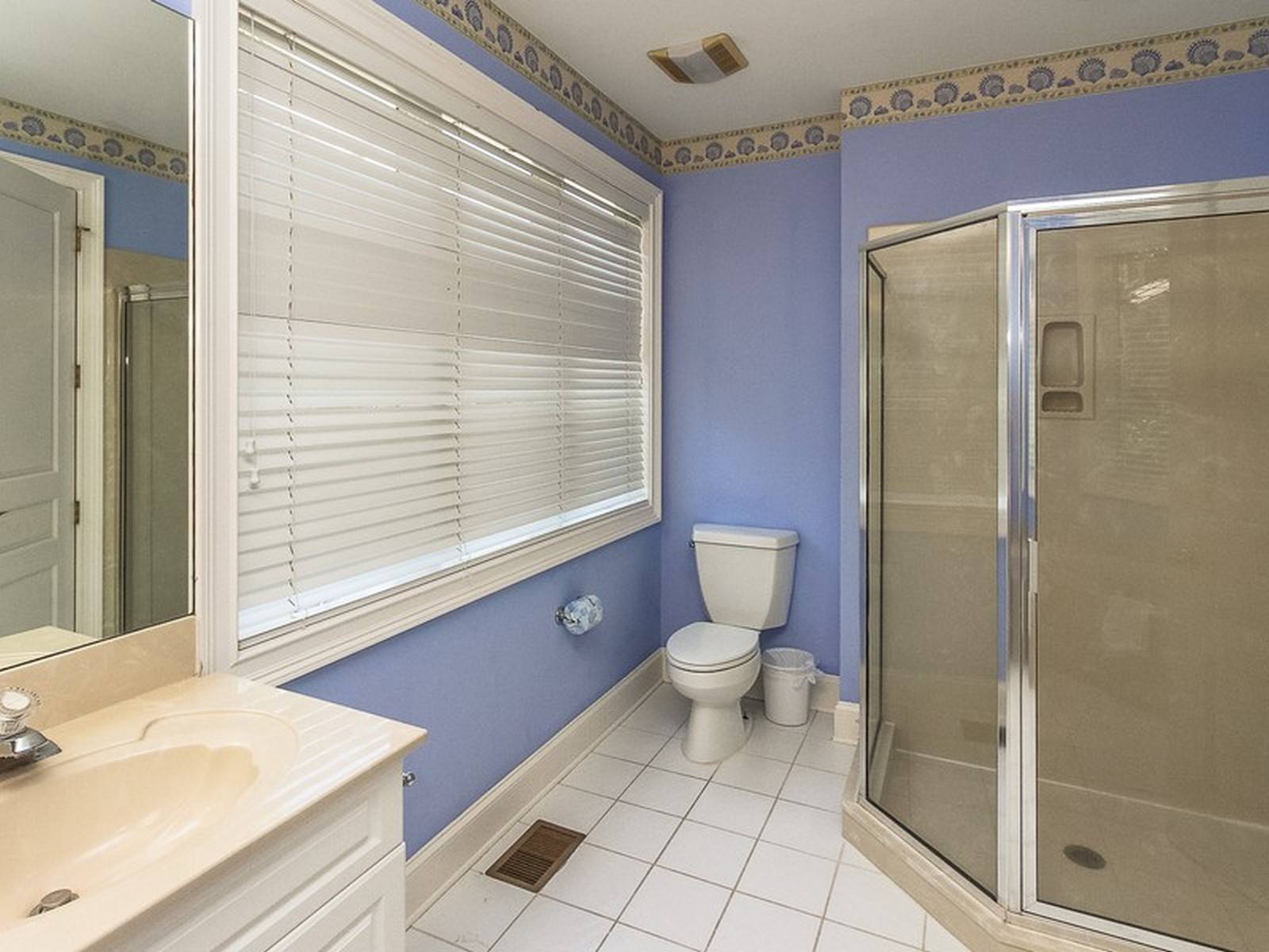 Upon entering the spacious foyer, you head up a few stairs into the living room that is carpeted with vaulted ceilings, spectacular arched windows, lots of comfortable seating, and two entries to the tiered deck leading out to the pool. There are two blue sofas, two armchairs with ottomans, a fireplace, and a mounted 42” TV. The built-in bookshelves have books, games, and puzzles for your enjoyment. The dining room has blue striped wallpaper and a glass table with six Rattan backed chairs. This room opens to the fully equipped, large eat-in kitchen where there is a glass table with six chairs by the windows. The kitchen has two sinks, two ovens, miles of countertop, and a central island for easily navigating those big family dinners. There is also a connected laundry/mud room with a half bath.