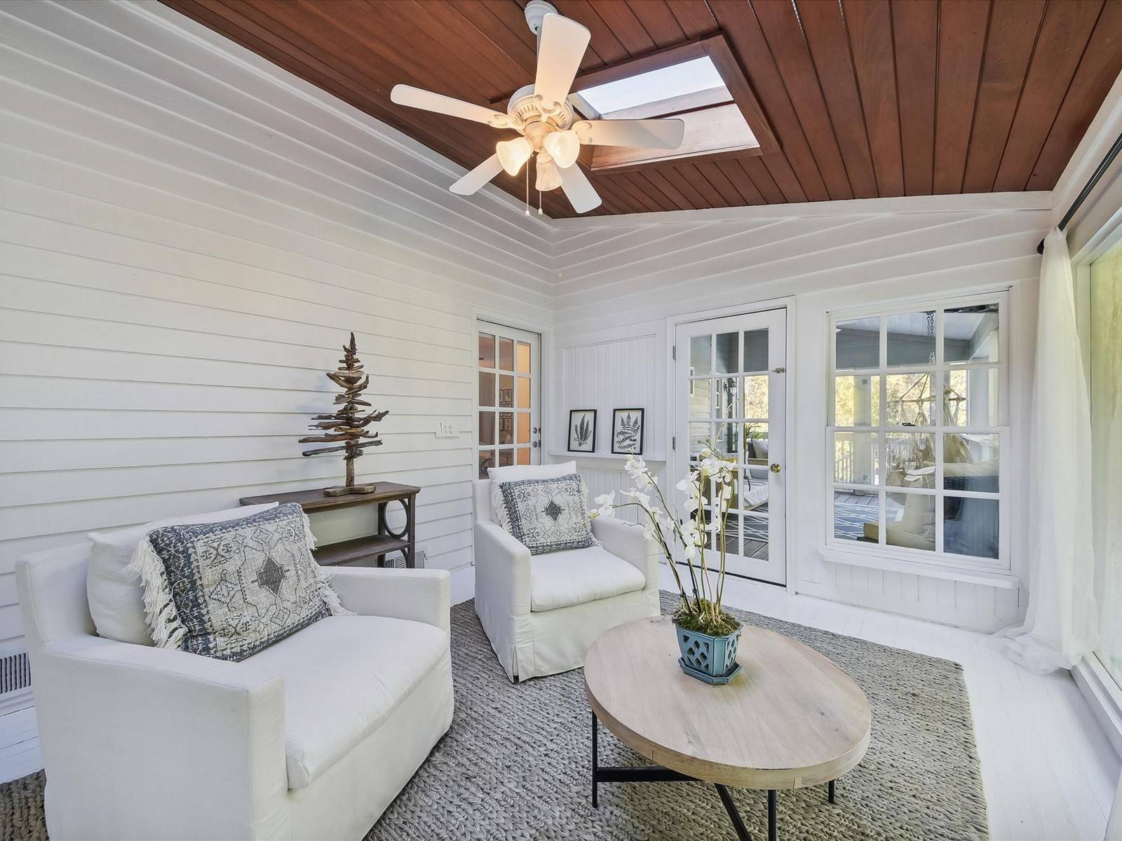 Down the hall from the entrance is a ½ bath with pedestal sink. This can also be accessed by the sitting room. At the end of the hall is the freshly renovated master suite with a king bed, 50″ SMART TV and large walk-in closet. The private bathroom has a double vanity and walk-in shower. This room has access to both a screened-in porch and a Carolina sun room. The screened-in porch has a porch swing, two swing chairs and two additional chairs. The Carolina room has sky lights and two chairs. A great place to sit and read a book!