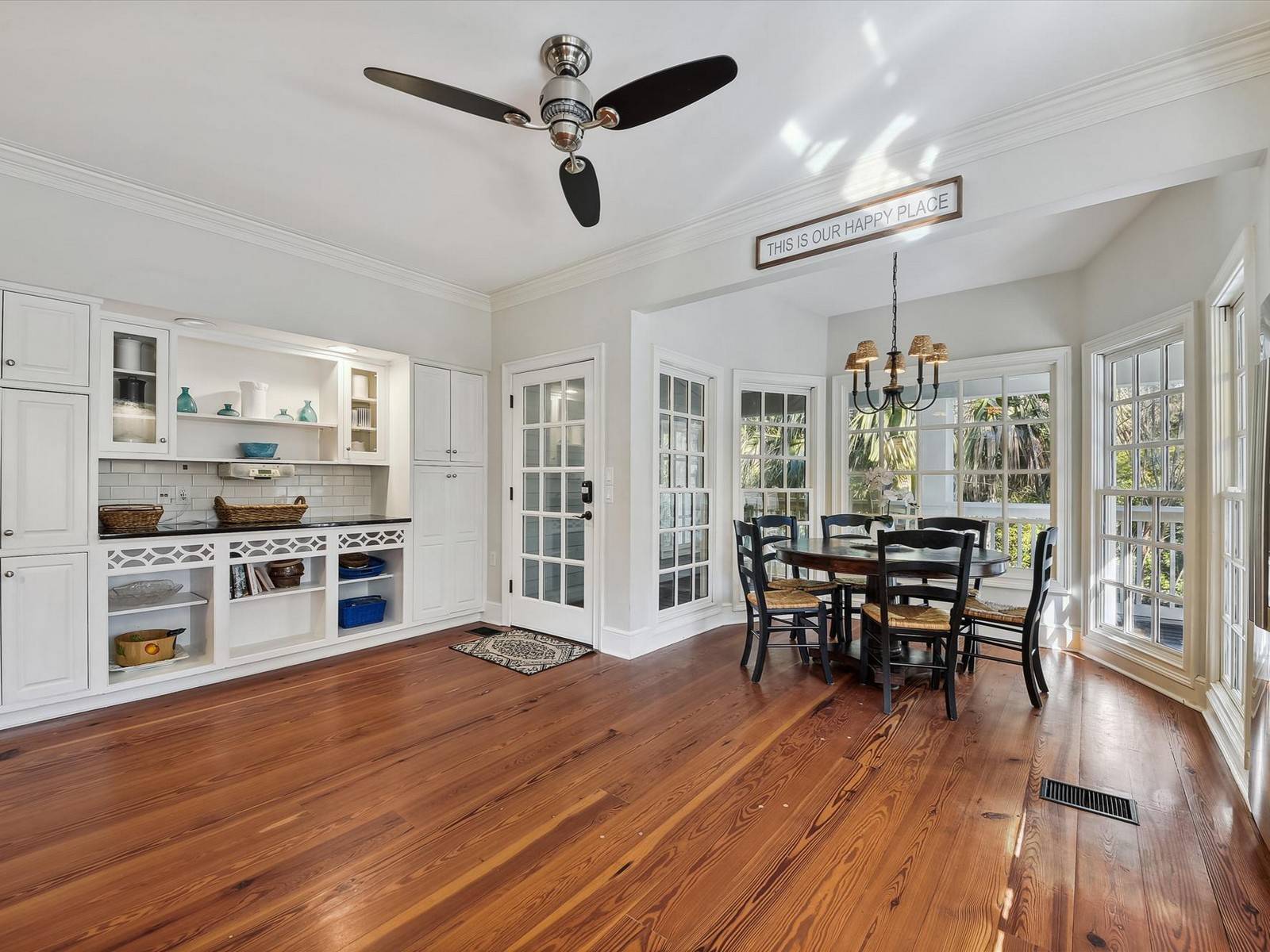 As you enter the home you first notice the beautiful hardwood floors, high ceilings and crystal chandelier in the entryway. Through the French doors on the left is a large sitting room with a gray sectional couch, two accent chairs and a 58” Roku TV with sound bar. The wet bar has a granite countertop and a wine fridge. Behind the couch is a wall-to-wall built-in bookshelf.