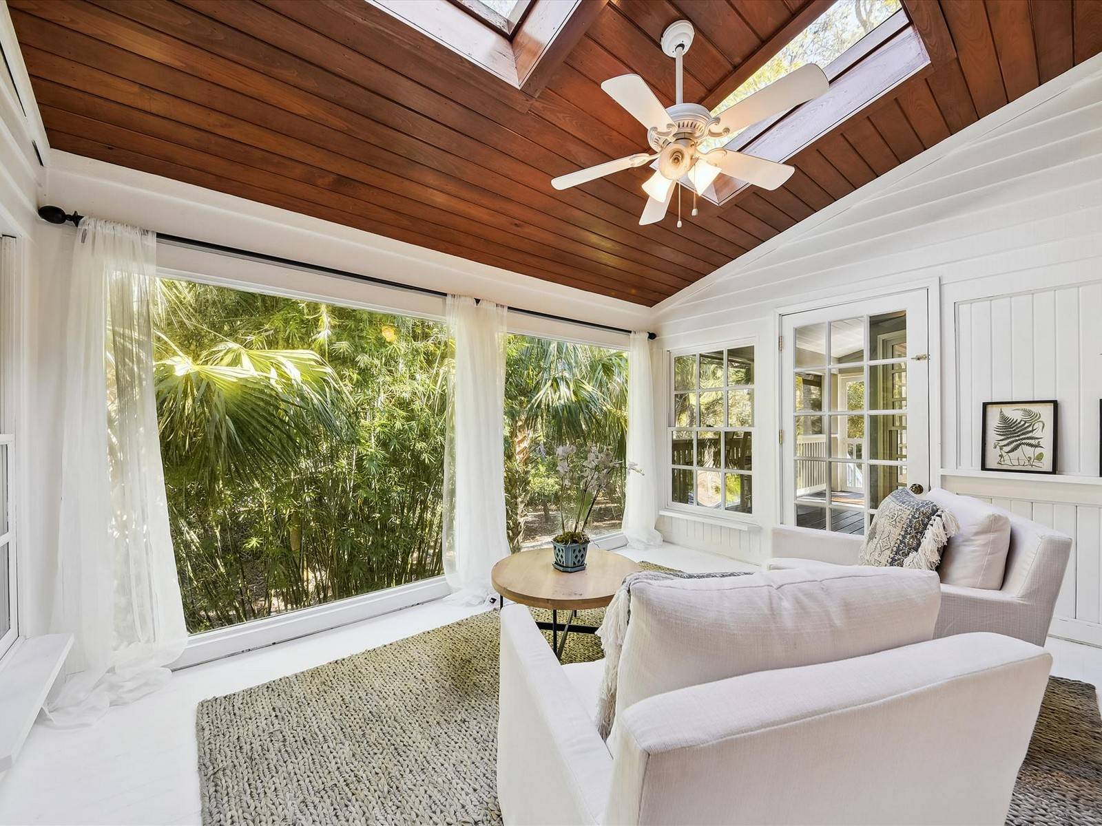 This classic Southern beach home features large rooms, 3 outdoor porches and 2 light-filled sun rooms. With hundreds of trees, the back and side yards provide privacy and opportunity to host with a pool, lounge areas and an outdoor bar.