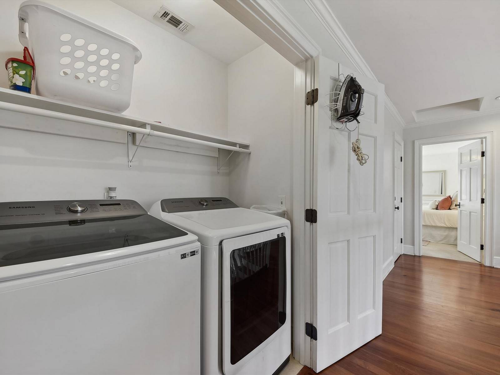Four bedrooms can be found on the second floor. At the top of the stairs is a bathroom with a single vanity and tub/shower combo. The laundry room is next to this behind closed doors. To the right there is a bedroom with two twin beds and a day bed with trundle. The next bedroom is a large room with a king bed, accent chair and 43” Roku TV. This room has a private bathroom with double vanities and a walk-in shower. The French doors open to another good size room that can be used as an office if you have any work you need to do while on vacation. On the left side of the hall there is another bedroom with a king bed, large closets and a 43” TV. The ensuite has a double vanity and walk-in shower. The final bedroom has two twin beds and a twin bunkbed set.